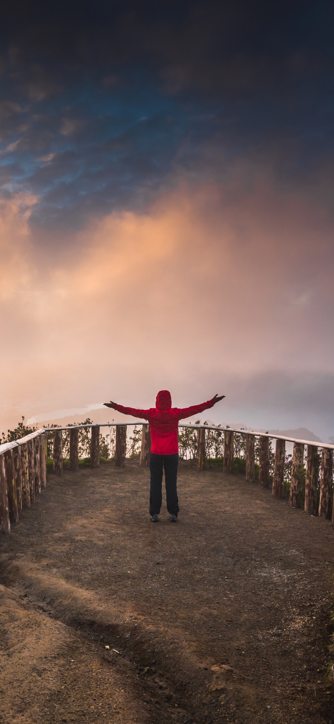 A person stands atop a bridge, arms outstretched against the backdrop of a vibrant sunset. The scene is rendered in a striking red and blue color palette. The composition and lighting create an atmosphere of tranquility and contemplation. 4K Ultra HD Wallpaper. This image captures the essence of adventure and freedom.