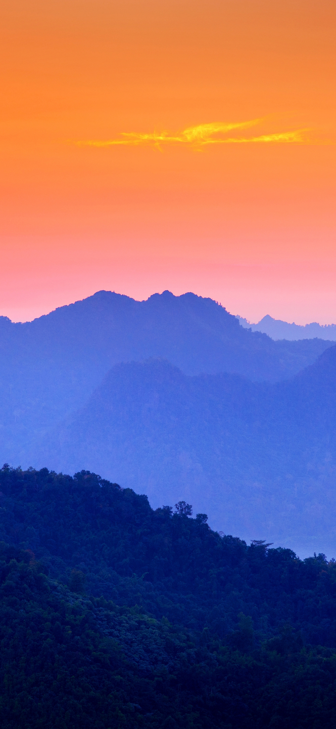 Immerse yourself in the breathtaking beauty of a majestic mountainside during sunset. This wallpaper features a stunning gradient of orange and blue hues that capture the essence of nature's tranquility. The perspective is from high above, offering a bird's-eye view of the landscape below. This serene scene is perfect for both iPhone and desktop backgrounds, providing a calming backdrop to any device. Enjoy the picturesque scenery with every glance at your wallpaper.